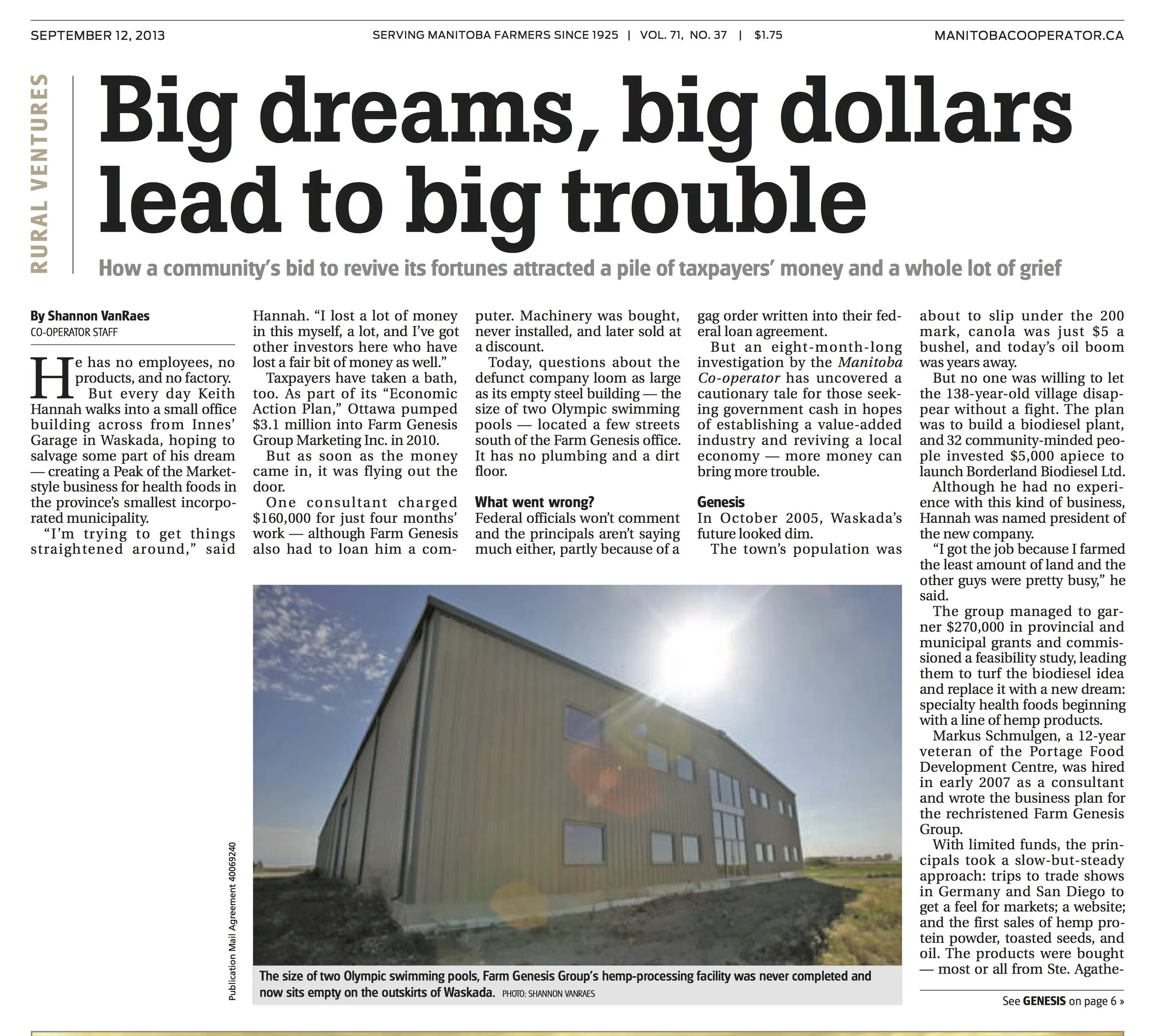 Taxpayers have taken a bath, too. As part of its “Economic Action Plan,” Ottawa pumped $3.1 million into Farm Genesis Group Marketing Inc. in 2010.